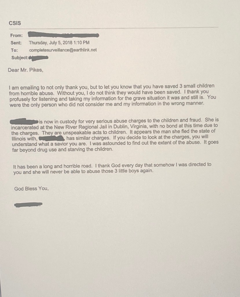 Complete Surveillance & Investigative Services, Inc. 1882 Crocketts Cove Rd Wytheville, VA 24382 Office: 276-288-3226 Cell: 276-620-0604 completesurveillance@earthlink.com